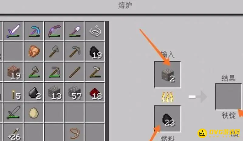 6、打开熔炉,放入煤炭和铁矿石,获得铁锭。