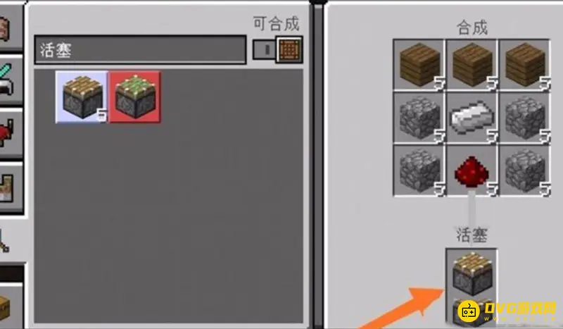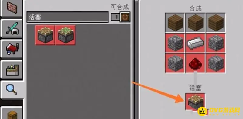 1、在工作台上查看活塞的配方,需要准备橡木板、圆石、铁块和红石。