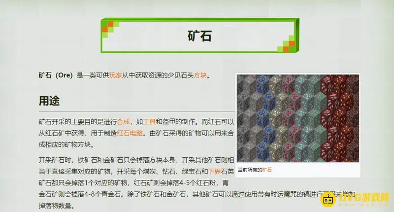开采每个煤炭、钻石、绿宝石和下界石英矿石都只会掉落1个对应的矿物,红石矿则会掉落4-5个红石粉,青金石矿则会掉落4-8个青金石。除了铁矿石和金矿石,其他矿石可以通过使用带有时运魔咒的镐进行开采来增加掉落物数量。