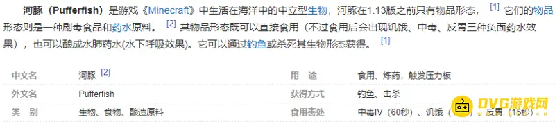 河豚可以吃的,可以恢复玩家1.2饱食度,但同时会附加玩家十五秒的饥饿、反胃效果,还有一分钟的中毒效果,给已经驯服的狗、猫喂食河豚不会出现负面效果,河豚是炼制水肺药水的重要材料,获取河豚最常用的方法就是钓鱼。