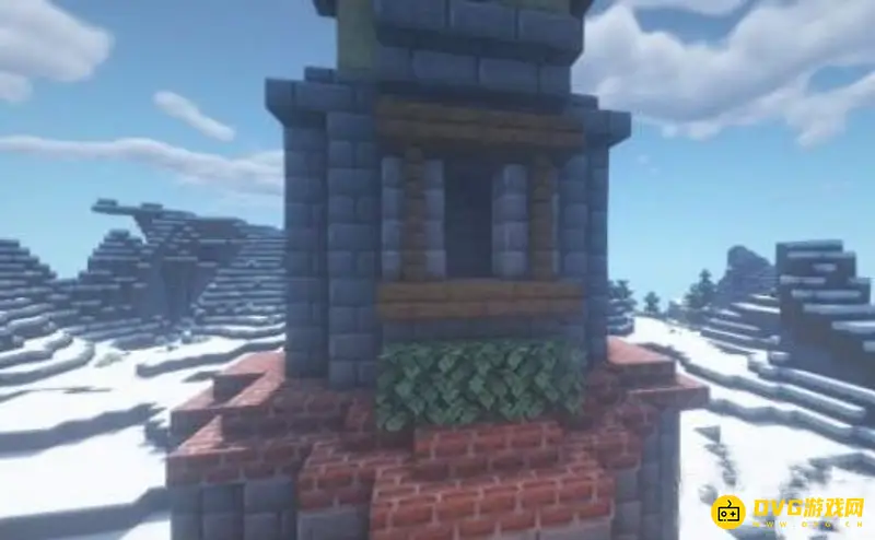3、石砖块外部使用倒置石砖楼梯铺设。用去皮白桦木和云杉木原木如图搭建,其余墙面用去皮白桦木填充。接下来用砖楼梯搭出屋檐,往外延伸一格。用砖块,砖楼梯和石砖墙进行封顶,这样塔楼基本就完成!正门使用去皮橡木跟橡木门制作入口。二层窗口使用橡木栅栏跟橡木台阶装饰,下面铺设一些树叶,增加自然的感觉