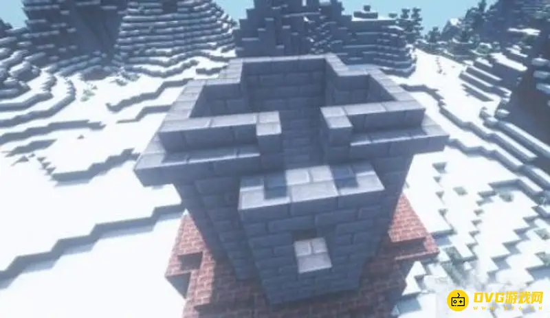 2、用石砖将整体加高,门口用錾制石砖替换部分石砖。用砖楼梯如图围一圈,做二楼的分割线。用石砖继续加高二层塔身,留一扇小窗户。用石砖楼梯如图围住,正面中间的部分不要围住。这里再放置三个石砖块。