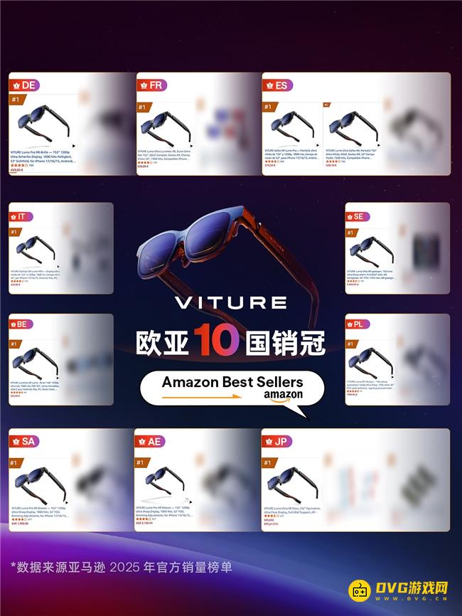 拿下2025年三季度美国AR市场冠军,主要得益于2025年7月新推出的VITURE Luma系列XR眼镜,全球首发手势操控与 6DoF 空间交互,并将入眼亮度提升至行业最高 1500 nits。根据亚马逊官方数据,VITURE Luma 系列在多个市场表现亮眼,包揽日本、德国、法国、西班牙、意大利、沙特阿拉伯等 欧亚 10 国亚马逊 AR 眼镜 Best Sellers,进一步巩固了其“全球消费者首选 XR 品牌”的地位。