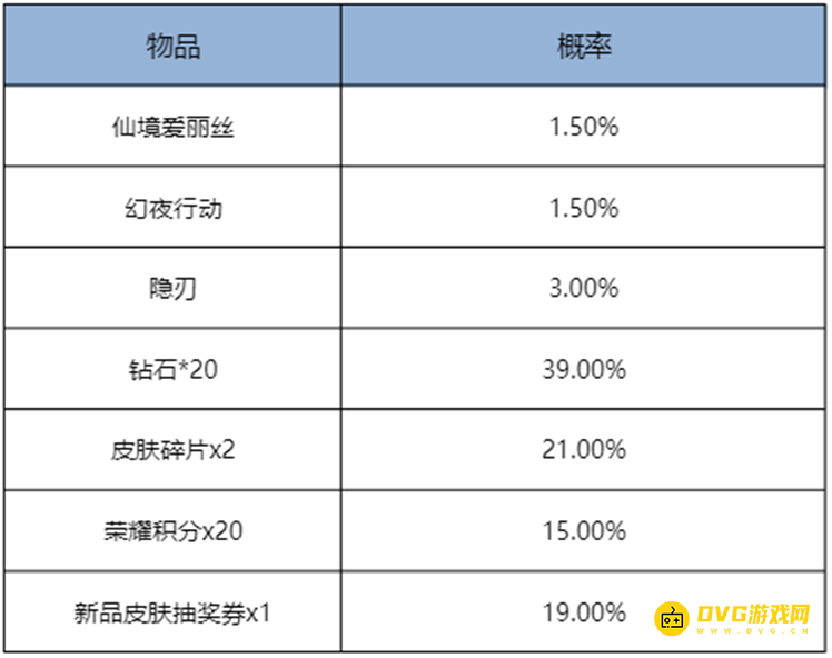 购买红蓝对决(1日),可额外获赠一个礼包,打开后可随机获得以下之一:仙境爱丽丝、幻夜行动、隐刃、皮肤碎片x2、荣耀积分x20、新品皮肤抽奖券x1、钻石x20。累计100次必得仙境爱丽丝和幻夜行动。