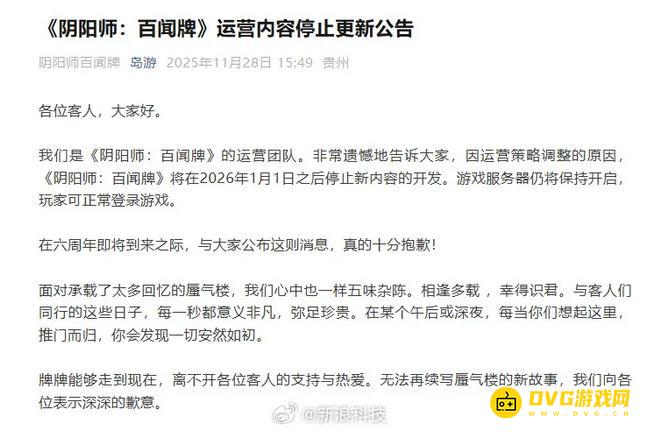 11月28日消息,网易《阴阳师:百闻牌》官微今天下午通过官微宣布,因运营策略调整,《阴阳师:百闻牌》将在2026年1月1日之后停止新内容的开发。游戏服务器仍将保持开启,玩家可正常登录游戏。